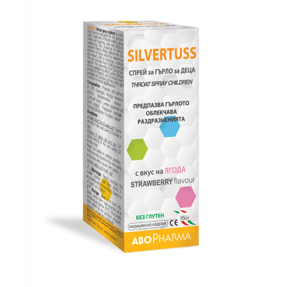 Спреят за гърло спада към класа на медицинските изделия и основното му действие е да намали дразненето на гърлото, болката и да улесни преглъщането. В състава му влизат екстракти от лечебна мъдрица, която възстановява гласа и бяла ружа, богата на клей, която има защитното действие върху устната лигавица от външни агенти. Силвъртус спрей за гърло съдържа и етерично масло от лимон, което има освежаващ ефект. Сухият екстракт от прополис и колоидното сребро имат антимикробно действие. С приятен вкус на ягода, което го прави подходящ за деца. Предлага се в опаковка от 30 мл.